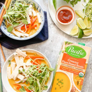 Pho in 20 minutes? Yes, please. This creamy pho includes warm turmeric and the savory flavor of fish sauce with carrots, mung bean sprouts, and wide rice noodles. For a fully vegan version of the recipe, swap out the fish sauce for soy sauce or coconut aminos. Pacific Foods Zesty Ginger and Turmeric Creamy Plant-Based Broth takes the creaminess of this dish to a whole new level.