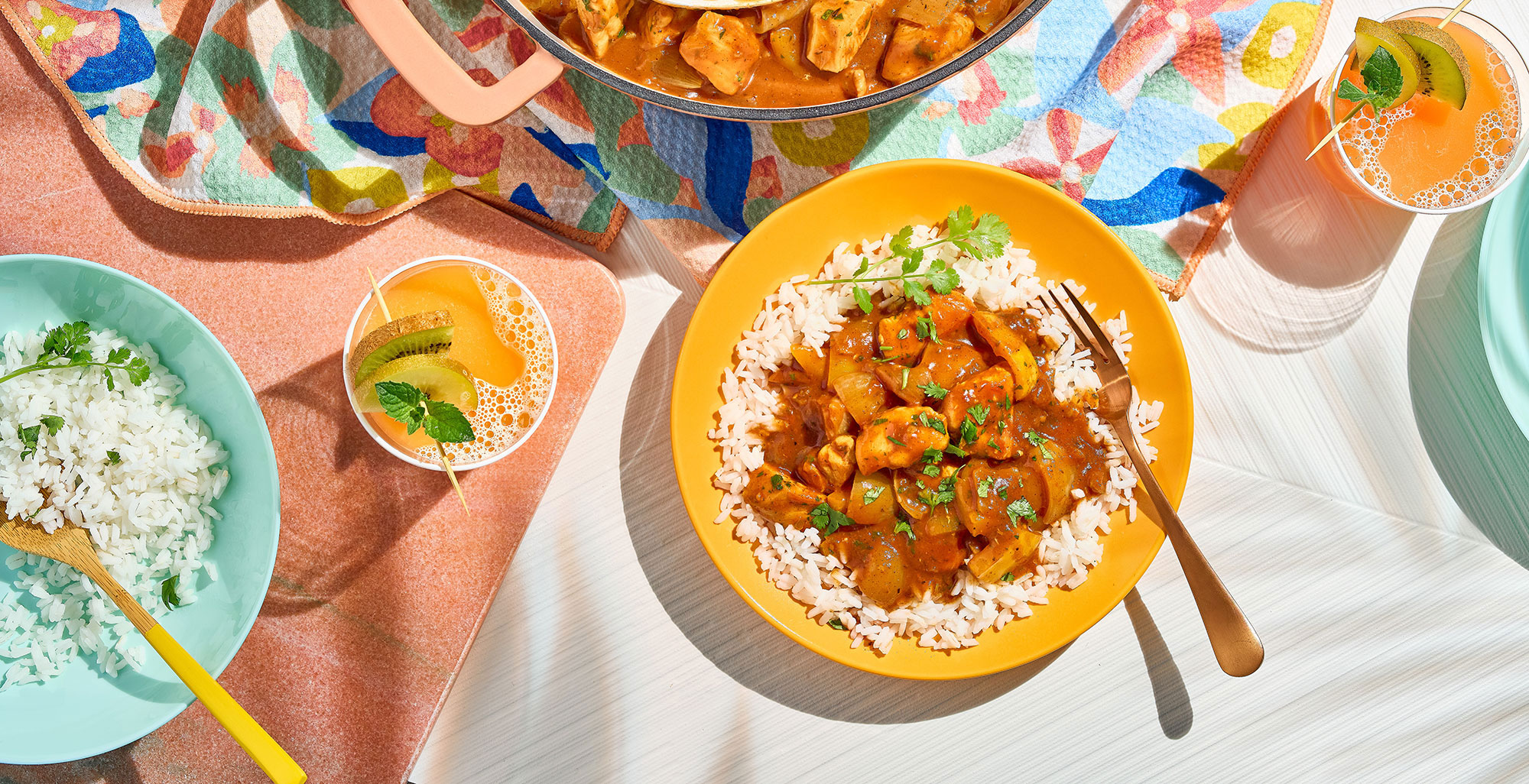 Bask in the deliciousness of this flavorful Caribbean coconut chicken with rice that is easy to make on even the busiest weeknights! This recipe uses Pacific Foods® Organic Condensed Tomato Soup as a fantastic, simple base to create a rich and satisfying sauce that blends perfectly with the flavor of Pacific coconut milk. With just 10 minutes of prep and 25 minutes of cook time, you'll have a taste of the tropics on your table. Enjoy tender chicken, peppers, onions and the vibrant flavors of jerk seasoning all simmered in a creamy coconut tomato sauce that gets served over fluffy rice. Perfect for a quick, flavorful and fuss-free meal!