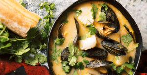 Pour in coconut milk and broth and let simmer for about 15 minutes, adding salt to taste. Add mussels and scallops and cover the pot. Let simmer for another 4 to 6 minutes until all the mussels are opened and scallops are opaque (discard any unopened mussels). Top with cilantro and serve with bread. Enjoy!