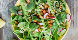 In a large mixing bowl toss spinach with cucumber, chickpeas, cooked couscous, radishes and dressing. Garnish with a handful of additional mint leaves and serve. Leftover dressing can be stored in the fridge for 5 days.
