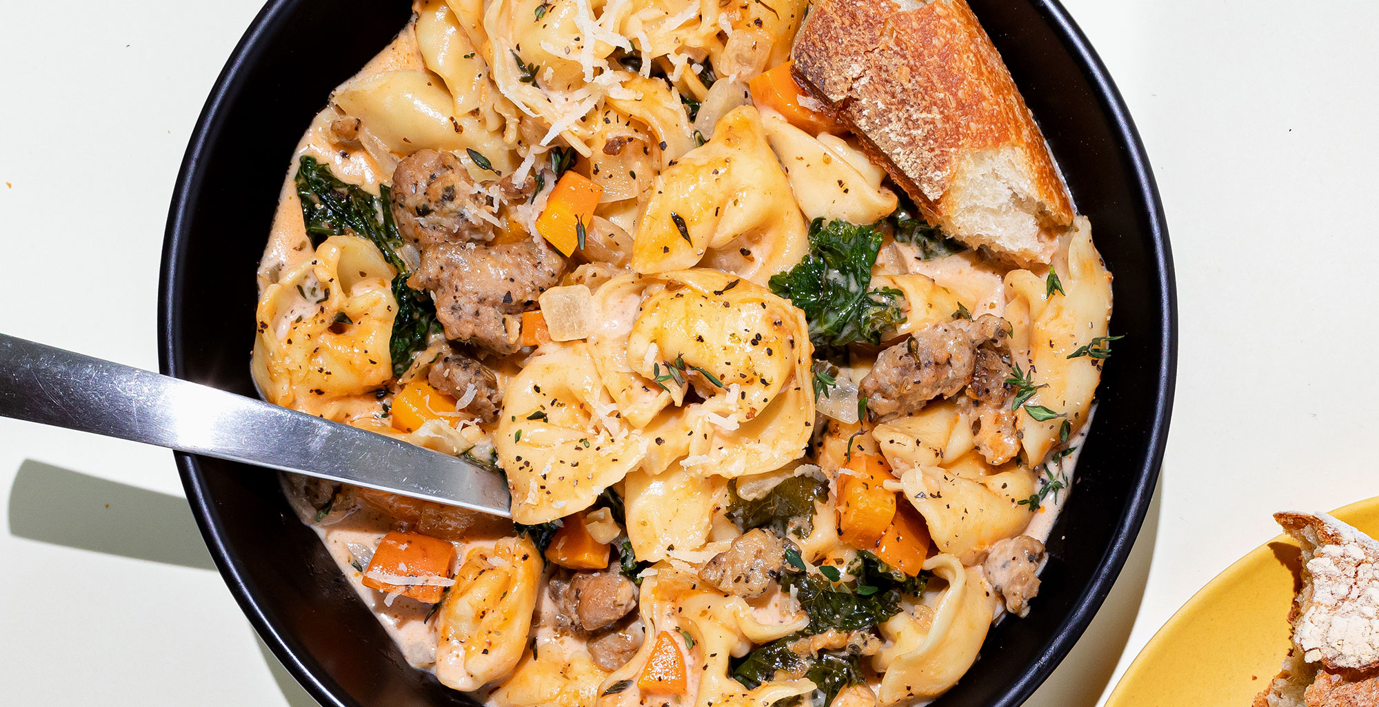 Add the sausage back to the pot along with the tortellini and kale. Simmer for 5 minutes or until the tortellini is tender. Serve immediately with freshly grated Parmesan, chopped parsley, warm bread, or any other desired toppings.