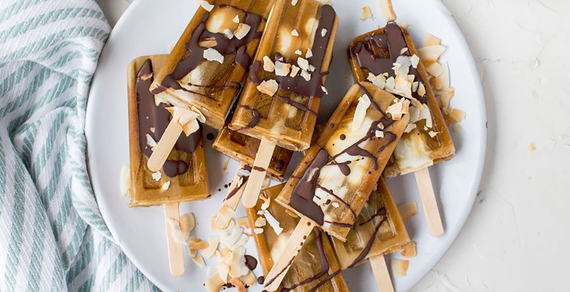 When popsicles are frozen, create chocolate drizzle. Whisk together melted coconut oil and cocoa powder until smooth. Remove popsicles from molds and place on a large platter. Tip: chilling the plate beforehand allows the popsicles to not melt right away! Drizzle popsicles with chocolate and sprinkle with toasted coconut flakes. Enjoy cold brew pops immediately or store in the freezer.