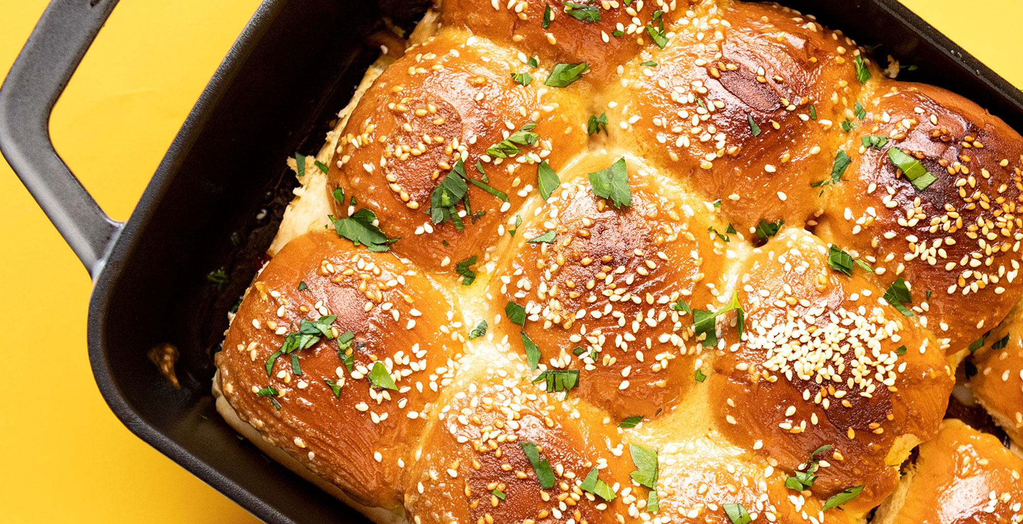 Preheat the oven to 350° Fahrenheit and grease a 9x13-inch baking sheet. Place the bottom half of the rolls in the bottom of the pan.