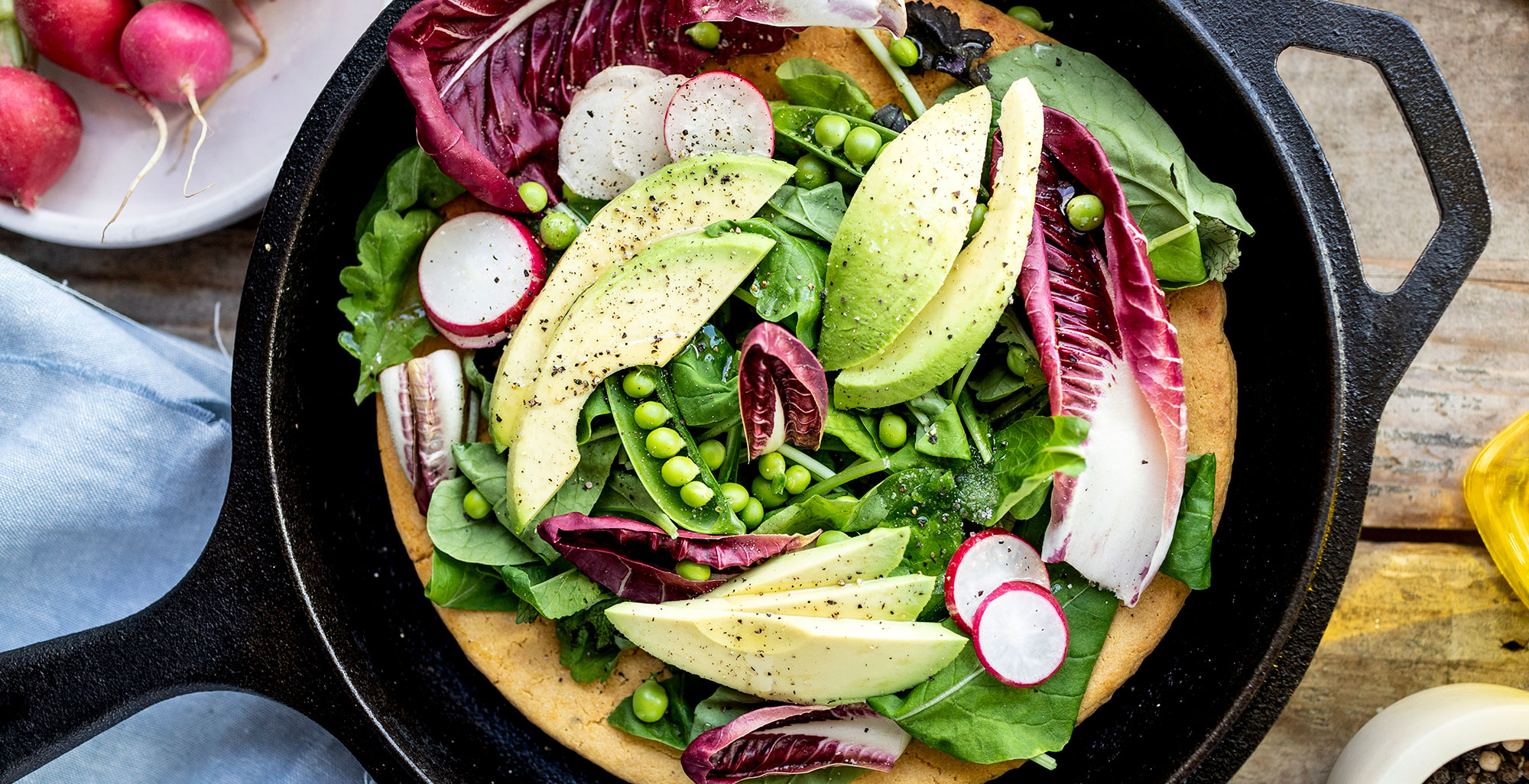 Bake the socca for 8 to 10 minutes, or until edges are golden. If you'd prefer a more golden top, broil socca for an additional 2 to 3 minutes. Carefully remove socca from the oven and top with spring greens, sliced avocado, peas, and radishes. Drizzle with additional olive oil, if desired, and slice. Enjoy!