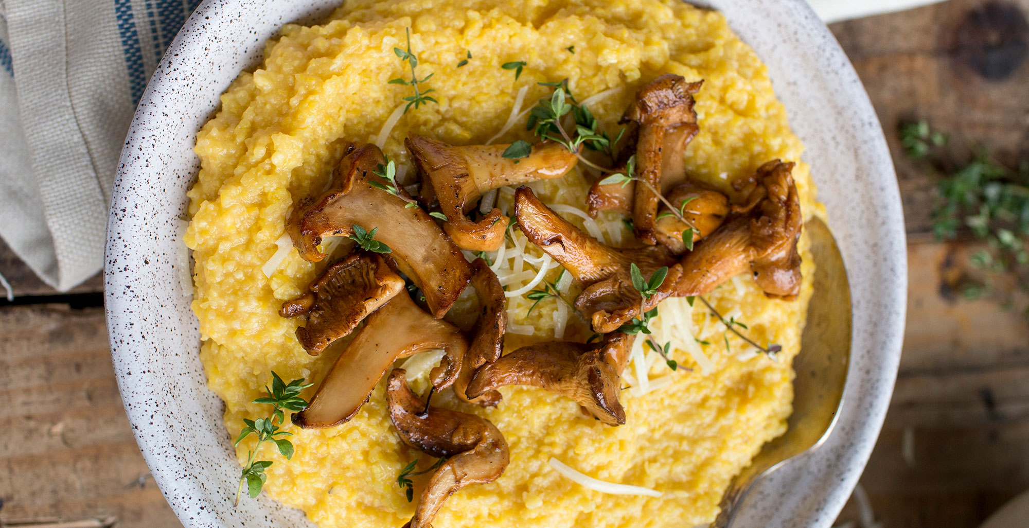 When polenta is nearly cooked, prepare mushrooms. Heat olive oil or butter in a medium skillet over medium high heat. Stir in mushrooms and season with sea salt, pepper, and thyme. Saute mushrooms for 10 to 12 minutes, or until tender. Divide polenta between bowls and top with mushrooms. Garnish with additional Parmesan cheese and fresh thyme. Enjoy!