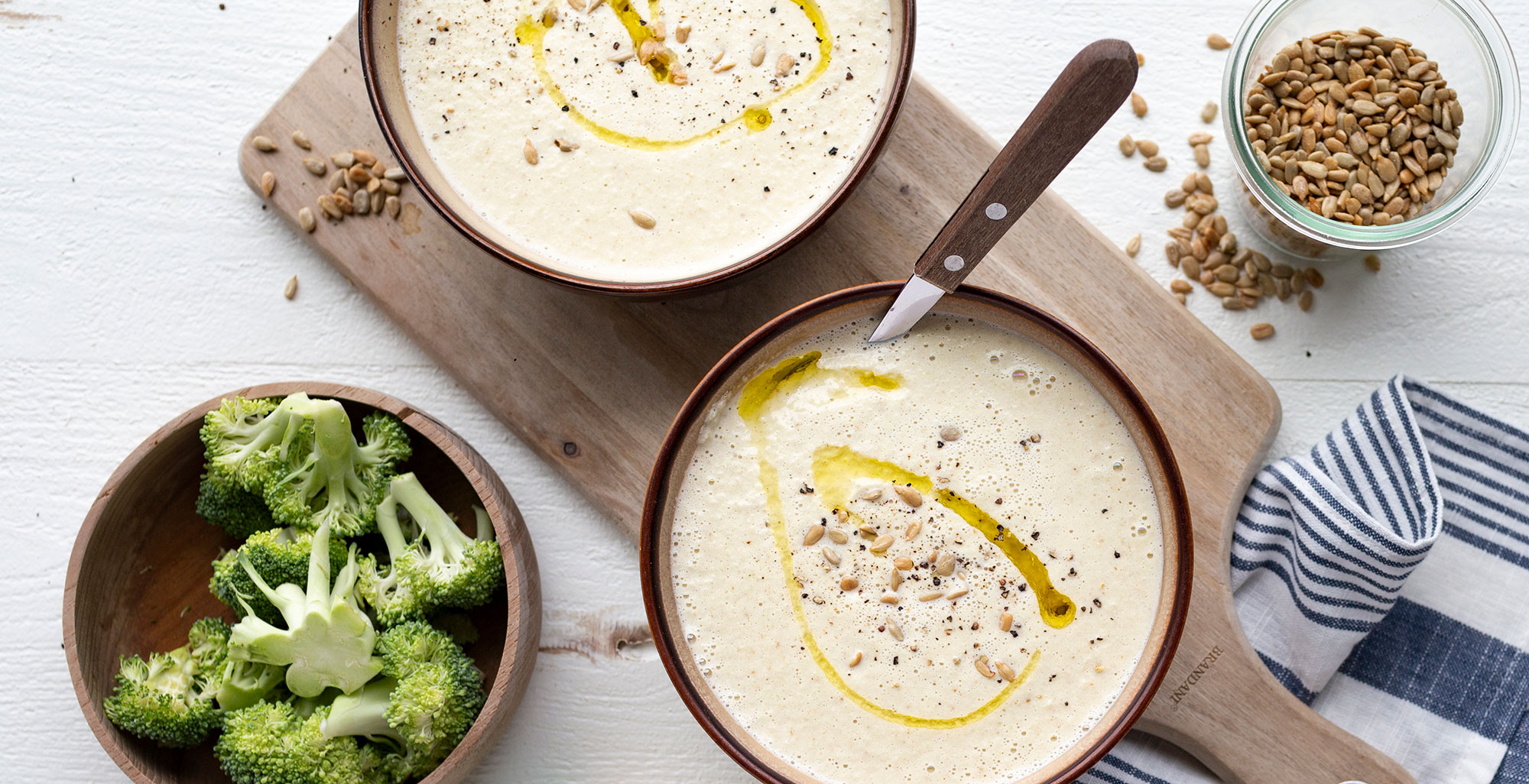 Turn Instant Pot on, press Saute, and wait 2 minutes for the pot to heat up. Add the onion and cook until starting to soften, about 2 to 3 minutes. Stir in the garlic and cook 30 seconds more, stirring constantly. Press Cancel to stop sauteeing. Add the broccoli stems, broth, sunflower seeds, chicken collagen, salt, and cream cheese to the pot.
