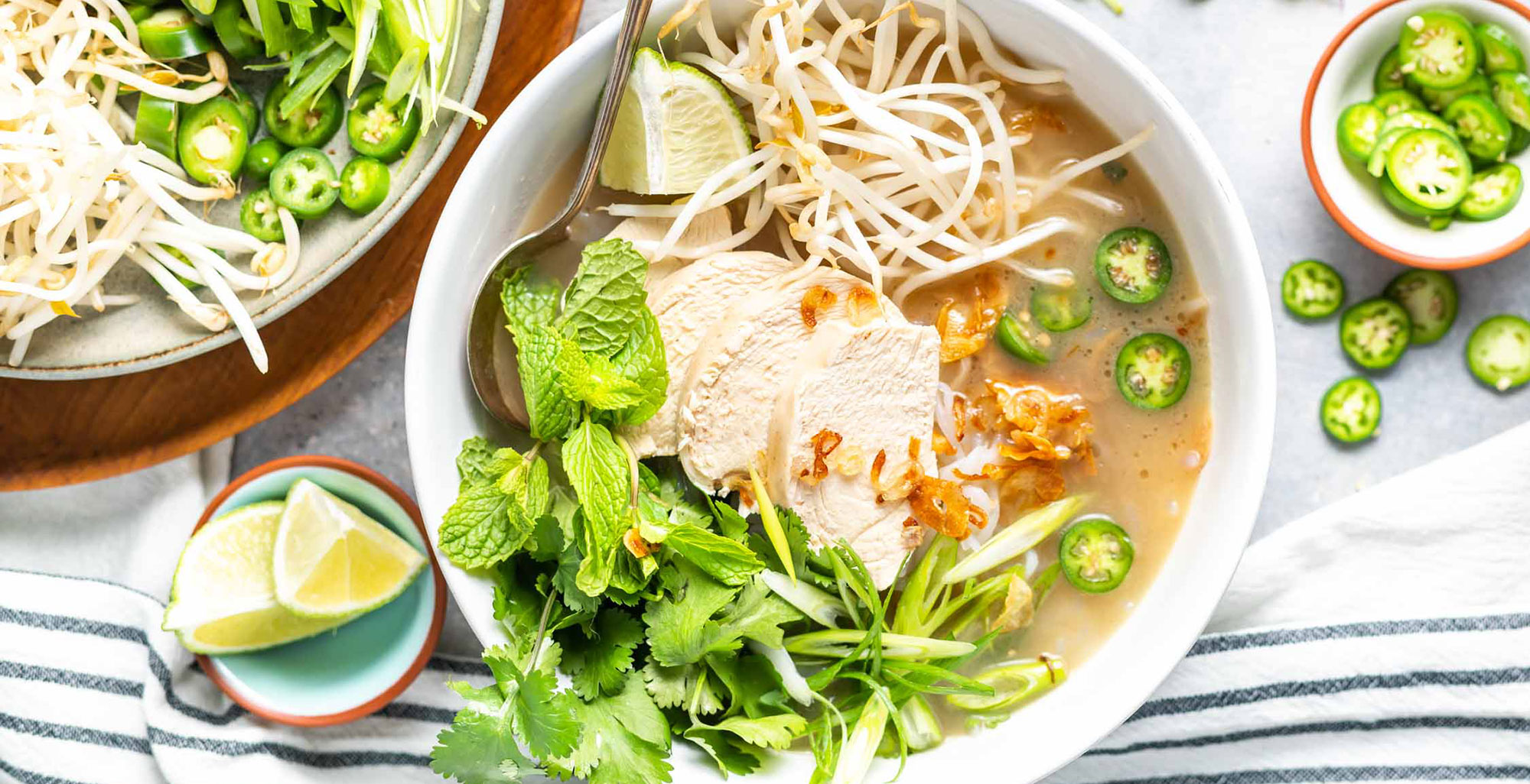 While the chicken is simmering, prepare the noodles according to the package directions. Remove the cooked chicken and shred. Taste the soup for salt and add more if needed. Place the prepared shirataki noodles in bowls and top with the chicken. Use a slotted spoon to strain out the soup solids then ladle the broth over the chicken and noodles. Top with toppings and serve.