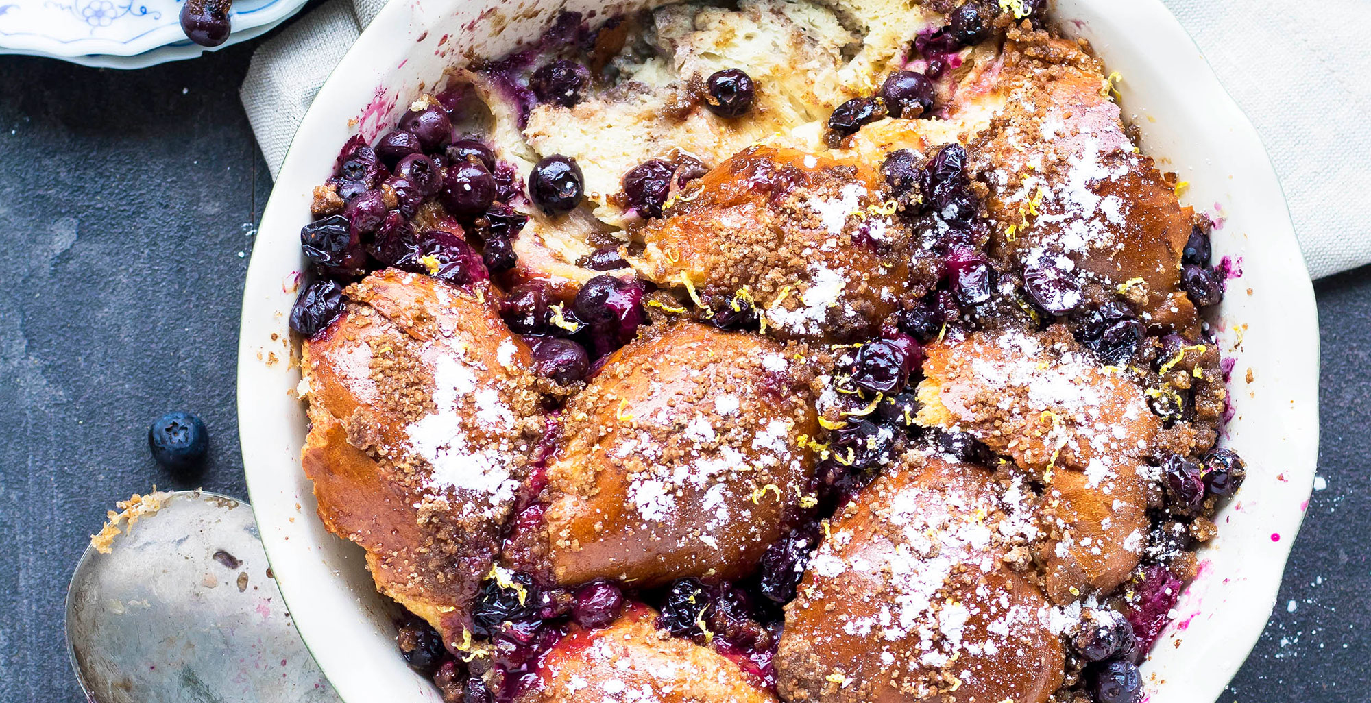 Grease a nonstick 9-inch baking dish with coconut oil. Place a single layer of bread cubes into the dish, then add a layer of blueberries and repeat until baking dish is full.