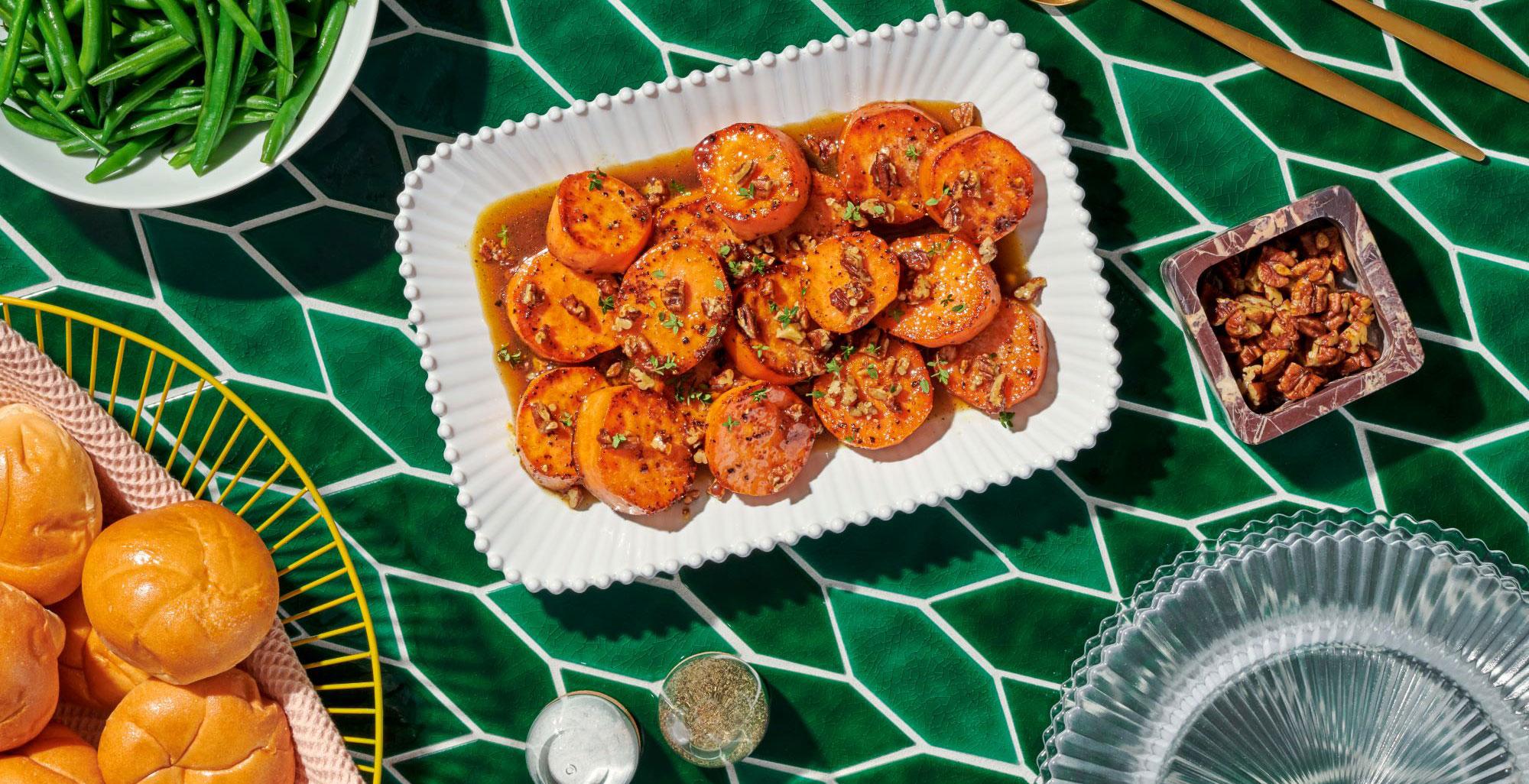 Heat the oven to 400°F. Line a rimmed baking sheet with parchment paper. Heat 2 tablespoons butter in a 12-inch ovenproof skillet over medium heat. Add the pecans and toss to coat. Cook and stir for 2 minutes. Add 2 tablespoons maple syrup and cook and stir until the pecans are caramelized. Spread the pecan mixture on the baking sheet. Let the skillet cool and wipe clean.