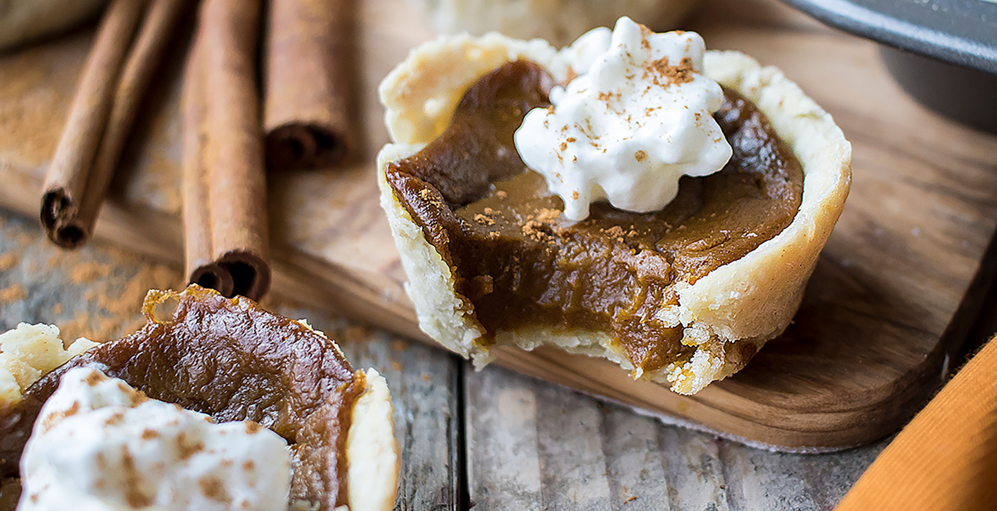 With a rolling pin, roll crust out carefully. Cut dough into 16 to 18 (1-inch) round disks using a jar or glass with a 1-inch top. Roll out disks again until large enough to fit inside muffin tins. Press the pastry disks into each muffin tin cup, then spoon pumpkin filling into each one.