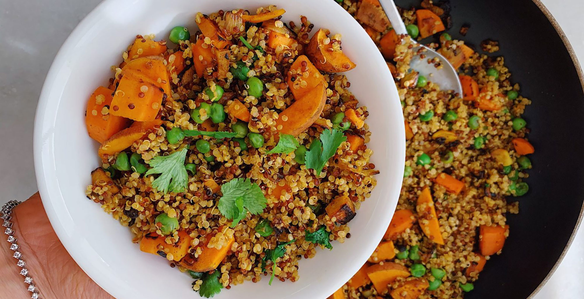 Add the carrots, peas, and any other vegetables you choose to use (some diced zucchini would also be nice here). Cover and cook until the carrots are tender. Season with salt and pepper, and add the cooked quinoa. I ended up adding about 3/4 of the quinoa, not all of it. Taste, season with salt and pepper to taste, and garnish with cilantro. Enjoy!
