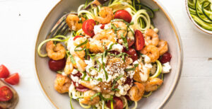 Assemble the bowls with the zoodles, corn, tomatoes, shrimp, and feta cheese. Toss with the yogurt dressing and garnish with the basil. Season to taste with salt and pepper.