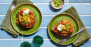 Transform sweet potatoes into a full (and easy!) weeknight meal by loading them up with this twist on a Tex-Mex classic — Turkey and Quinoa Chili. Pacific Foods® Organic Unsalted Chicken Broth adds extra savoriness to the quinoa base, while the hearty turkey, earthy black beans, and zesty spices are the perfect complement to tender, nutty sweet potatoes. Pro tip: set out toppings like shredded cheese, sour cream, pickled jalapenos, and sliced scallions so everyone can customize this dish to their tastes.