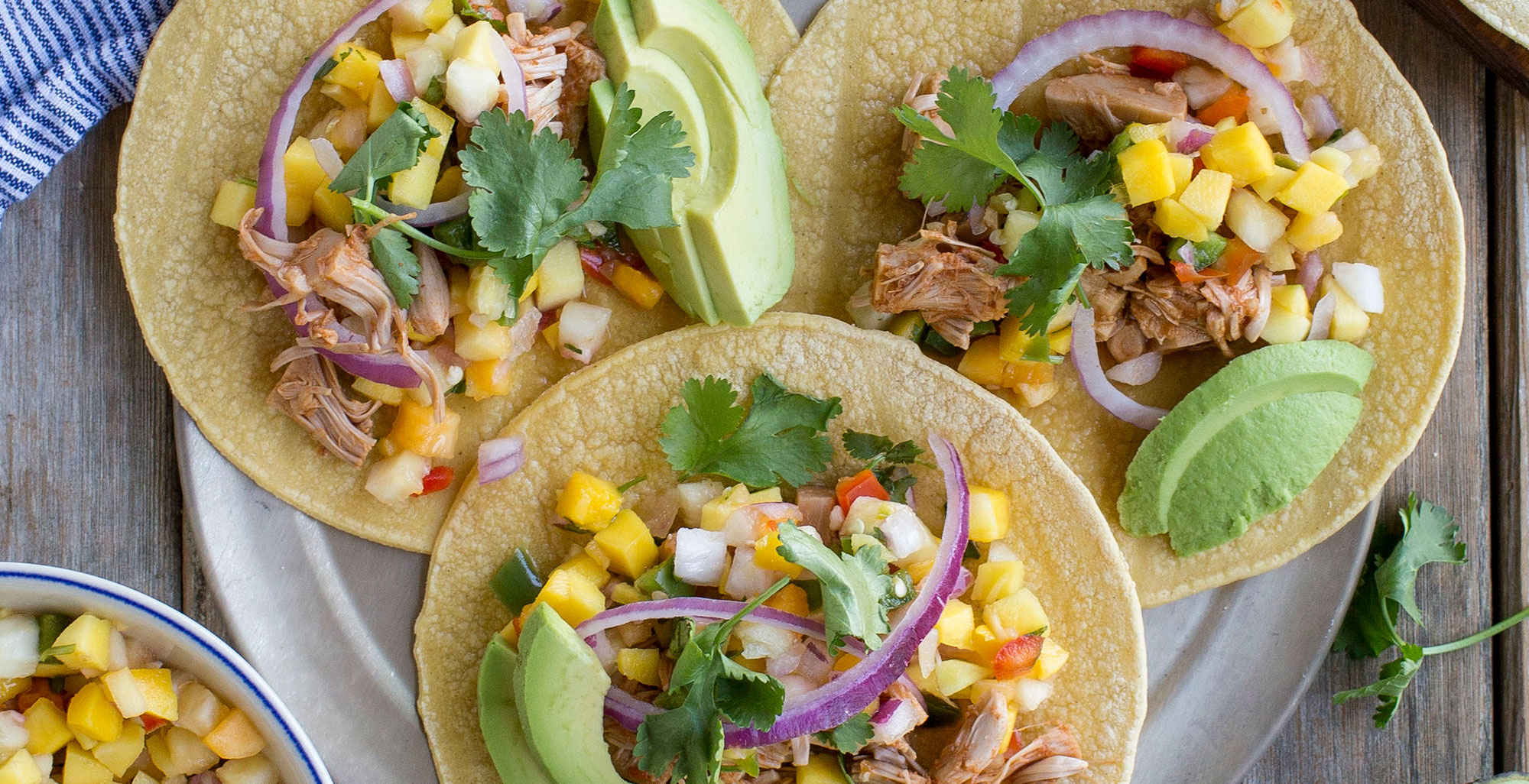 While jackfruit cooks, prep the mango salsa. In a bowl combine diced mango, pineapple, jalapeno, bell pepper, lime juice, and salt. Stir well. Create tacos: divide tacos and top with jackfruit, mango salsa, and sliced avocado. Garnish with cilantro and enjoy!