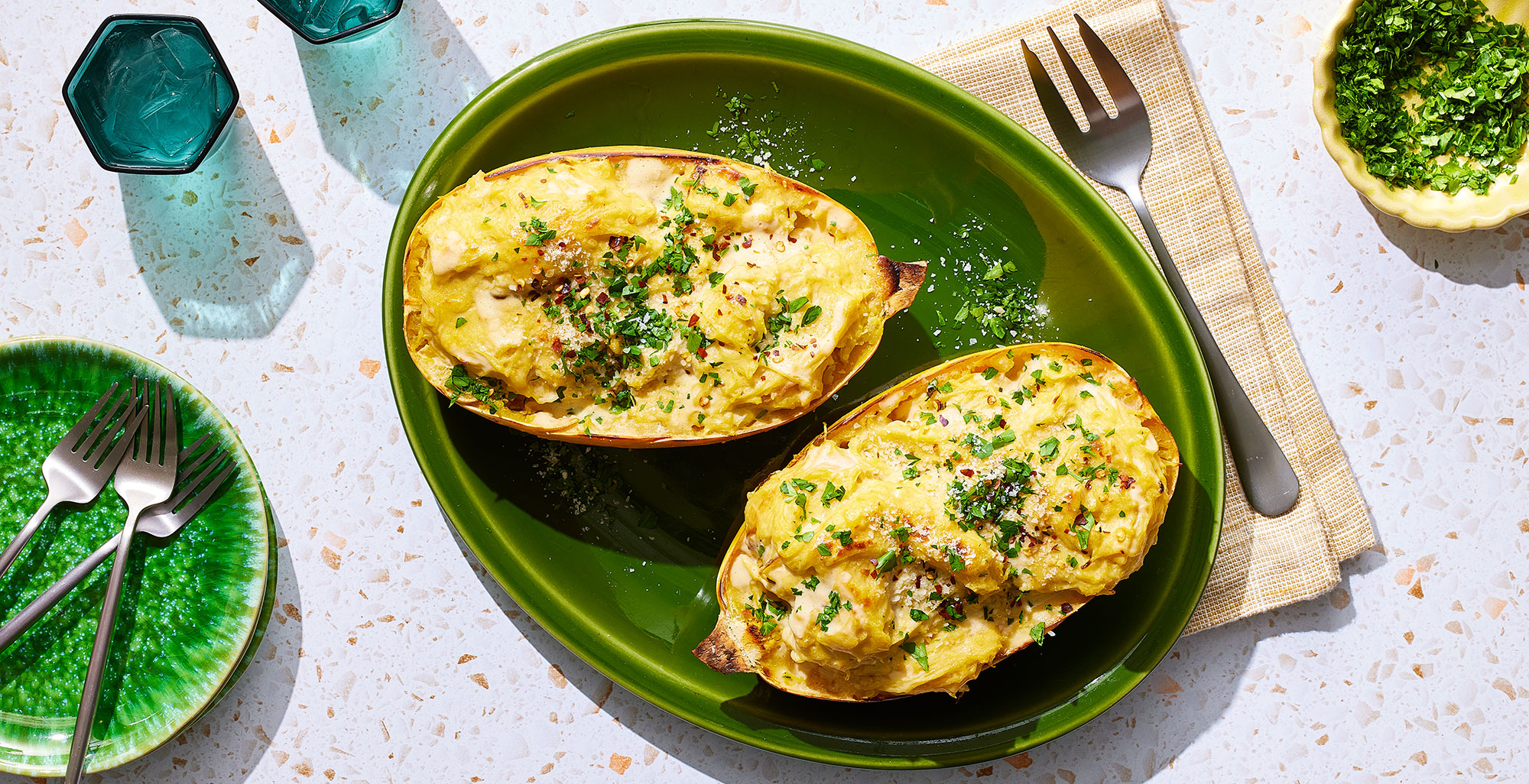 Return the squash halves to the oven on the parchment lined baking sheet and bake for 30 to 35 minutes, or until a crust forms on top and is lightly browned in spots. Without removing squashes, increase oven temperature to broil and broil for 1 to 3 minutes to brown further. Serve garnished with minced parsley and additional crushed red pepper.