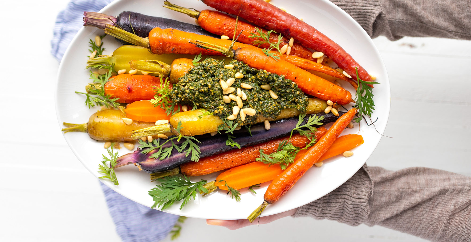 Preheat oven to 475°F. Cut green carrot tops from carrots. Remove thick stems and reserve small, fine carrot top leaves. Set aside. Add whole carrots to a large baking tray. Drizzle with oil and sprinkle with first amounts of sea salt and pepper.