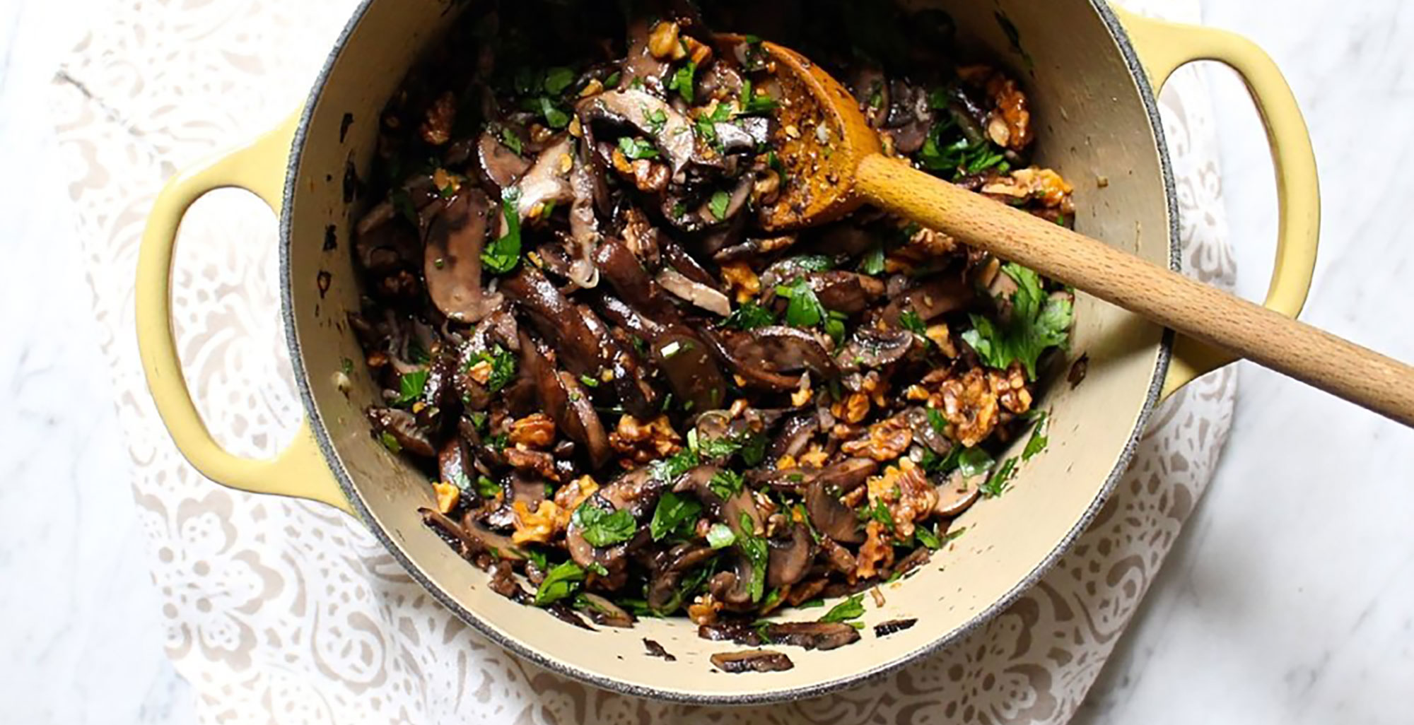 While the rice cooks, prepare the mushrooms. In a large skillet over medium heat, warm 2 tablespoons olive oil and the minced garlic. Add the mushrooms, thyme, and a pinch more salt and pepper. Cook, stirring occasionally, until nicely browned, about 12 minutes. Add more olive oil, if needed. Transfer to the bowl with the rice and add most of the parsley, reserving some for garnish, lemon zest, and toasted walnuts. Mix well to combine.